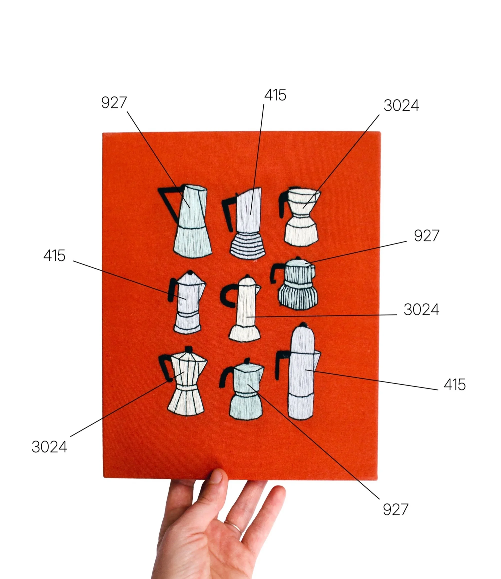 Fill each percolator with vertical satin stitch using your selected color of embroidery floss. If you need a refresher on stitch techniques, you can find an illustrated stitch glossary here.